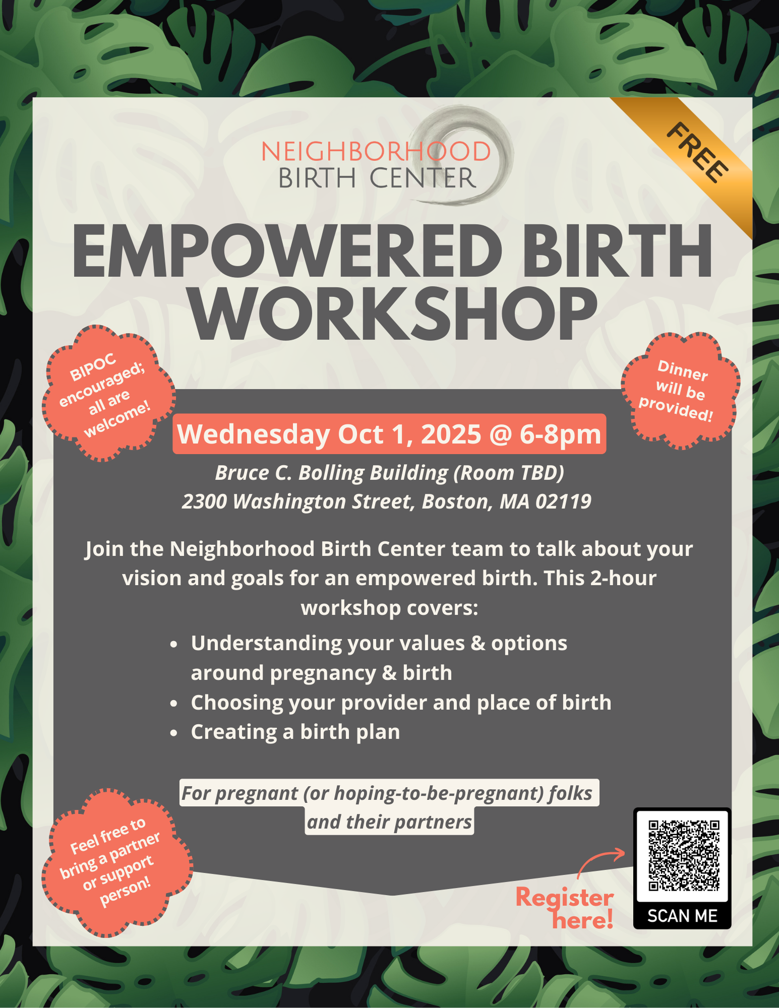 Workshop is FREE. Dinner will be served. Please feel free to bring a partner or chosen support person -- just make sure to register them for a ticket.
